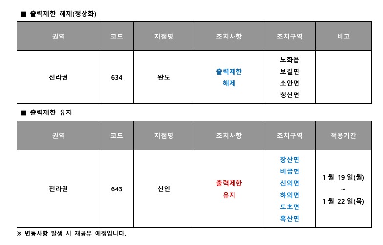 금일부터 1월 22일(목)까지 4일간 아래 지역에 한해 송장 출력제한이 진행될 예정이오니, 주문에 참고 부탁드립니다.